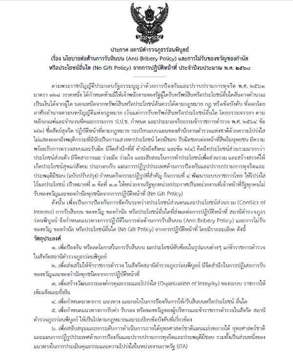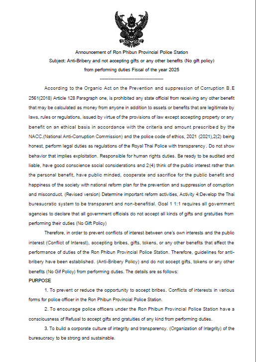 วันจันทร์ที่ 23 ธ.ค.67 เวลา 11.00 น. สภ.ร่อนพิบูลย์ จัดกิจกรรมการอบรมให้ความรู้เพื่อส่งเสริมจริยธรรม จรรยาบรรณ โปร่งใส และต่อต้านการทุจริต นำโดย พ.ต.อ.ชัยรัตน์ บัวขม ผกก.สภ.ร่อนพิบูลย์ พ.ต.ท.วินัย รัตนจิตต์ รอง ผกก.ป. สภ.ร่อนพิบูลย์ พ.ต.ท.ไพฑูรย์ อินทรพิบูลย์ รอง ผกก.สส.สภ.ร่อนพิบูลย์ พ.ต.ท.ดุษฎี อู่วงศ์ รอง ผกก. (สอบสวน) สภ.ร่อนพิบูลย์ พร้อมด้วยข้าราชการตำรวจในสังกัด เข้าร่วมกิจกรรมส่งเสริมการสร้างวัฒนธรรมองค์กร ในด้านคุณธรรมและความโปร่งใส รวมถึงการสร้างจิตสำนึกของบุคลากรในการปฏิบัติงาน และการพัฒนาความรู้ ความเข้าใจเกี่ยวกับการป้องกันและปราบปรามการทุจริต โดยข้าราชการตำรวจ สภ.ร่อนพิบูลย์ ทุกนาย เรียนรู้ผ่าน ช่องทางสื่อออนไลน์ Yutube ณ ห้องประชุม สภ.ร่อนพิบูลย์