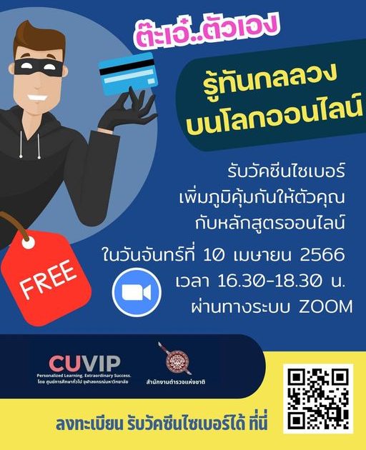 อ้าว เร็วววววว May 19, 2566 by admin / ข่าวประชาสัมพันธ์,ข่าวฝากประชาสัมพันธ์ อ้าว เร็วววววว ปกติของถูกมักไม่ค่อยดี และของฟรีก็ไม่มีในโลกนะจ๊ะ แต่งานนี้ รับรองว่าฟรี และดีแน่ๆ เรียนออนไลน์ ถามตอบได้ กับ #รู้ทันกลโกลบนโลกออนไลน์ อย่างว่าแหละนะ ทุกวันนี้ มิจฉาชีพก็มาสารพัดรูปแบบ กลโกงก็มากขึ้นเรื่อยๆ คอร์สนี้แหละ จะทำให้ทุกคนบอกได้ว่า #ไม่ได้แอ้มฉันหรอก #ฉันรู้ทันย่ะ งานนี้ ม.จุฬา เขาร่วมมือกับตำรวจ จัดคอร์สออนไลน์ ให้ฟรีๆ เลยค่าาาา จันทร์ ที่ 10 เมษายน 2566 เวลา 16.30-18.30 น. ใช้ระบบ zoom ว่ากันไปเลย แหมทีเห็นของฟรีอย่างอื่นน่ะตาลุกวาว แล้วงานนี้ล่ะ จะช้าอยู่ทำไม ไปลงทะเบียนกันเลย สแกนคิวอาร์โค๊ดในกราฟฟิคนะคะ ๆ Facebook iconFacebookTwitter iconTwitterLINE iconLine