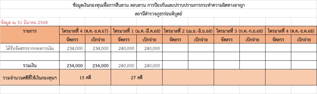 • ข้อมูลกองทุนเพื่อการสืบสวนสอบสวนการป้องกันและปราบปรามกระทำผิดทางอาญา ของสภ.ร่อนพิบูลย์ ในรูปแบบ Excel คลิ๊กที่นี่