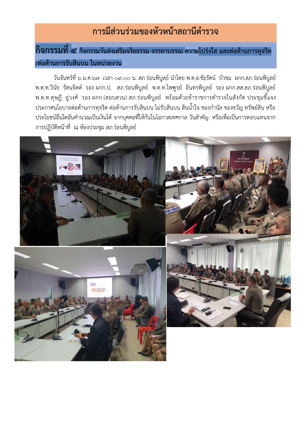 กิจกรรมที่ 4 กิจกรรมวันส่งเสริมจริยธรรม จรรยาบรรณ ความโปร่งใส และต่อต้านการทุจริต /ต่อต้านการรับสินบน ในหน่วยงาน