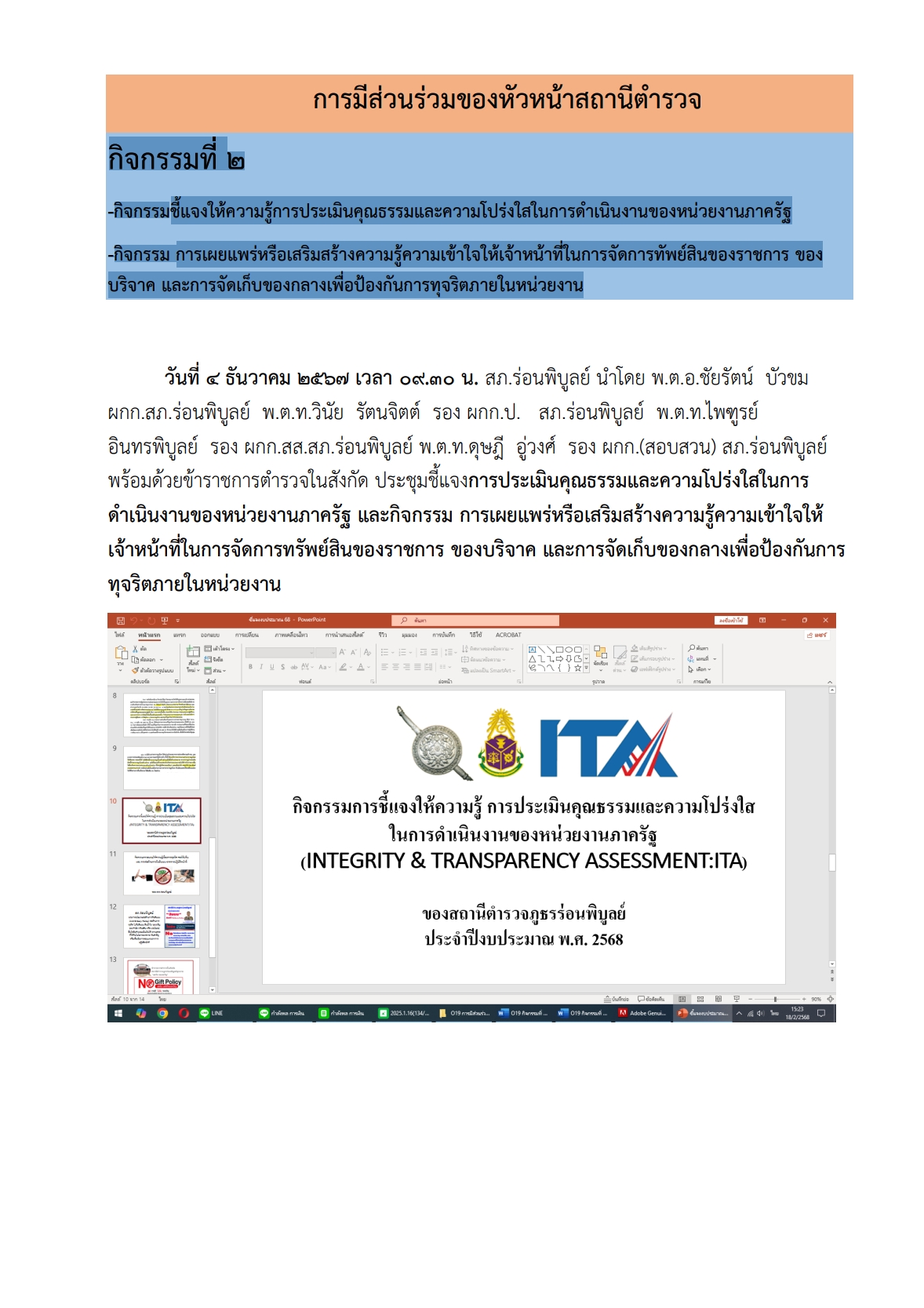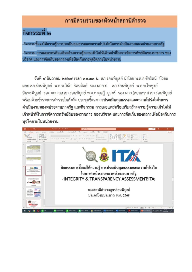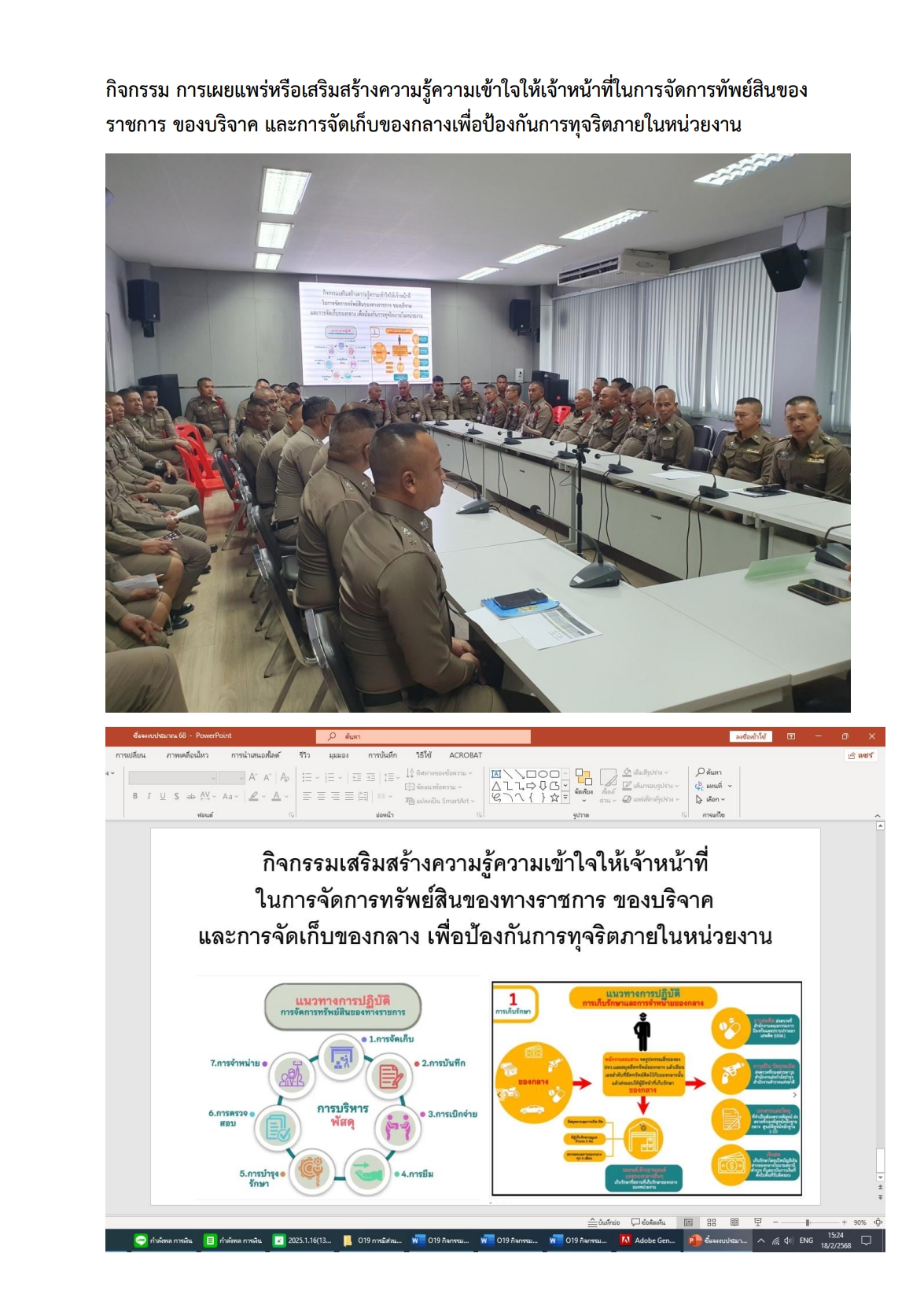 -กิจกรรม การเผยแพร่หรือเสริมสร้างความรู้ความเข้าใจให้เจ้าหน้าที่ในการจัดการทัพย์สินของราชการ ของ บริจาค และการจัดเก็บของกลางเพื่อป้องกันการทุจริตภายในหน่วยงาน