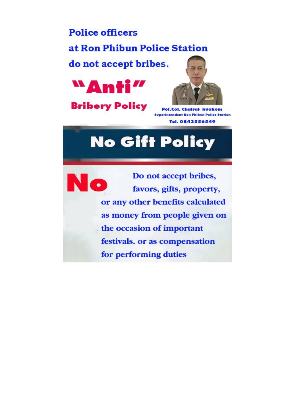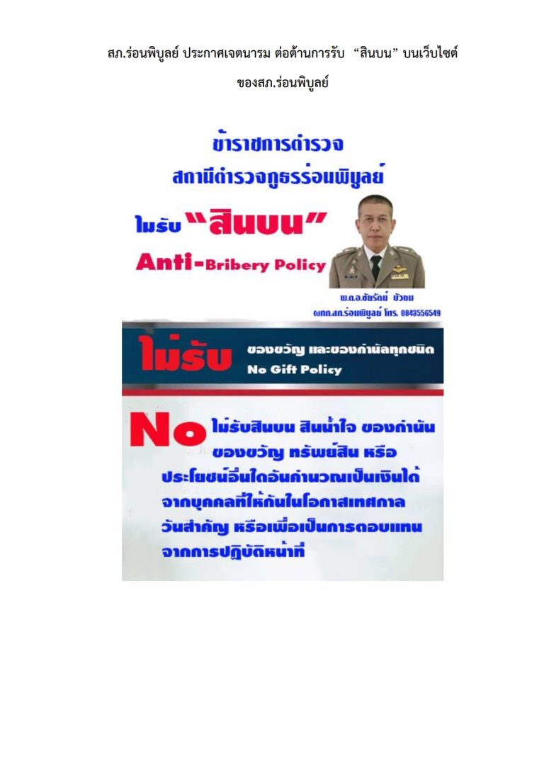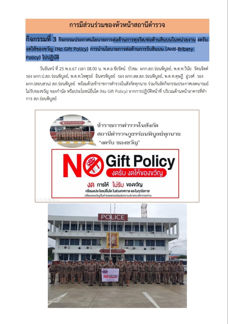 กิจกรรมประกาศนโยบายการต่อต้านการทุจริต/ต่อต้านสินบนในหน่วยงาน งดรับ งดให้ของขวัญ (No Gift Policy) การนำนโยบายการต่อต้านการรับสินบน (Anti-Bribery Policy) ไปปฏิบัติ