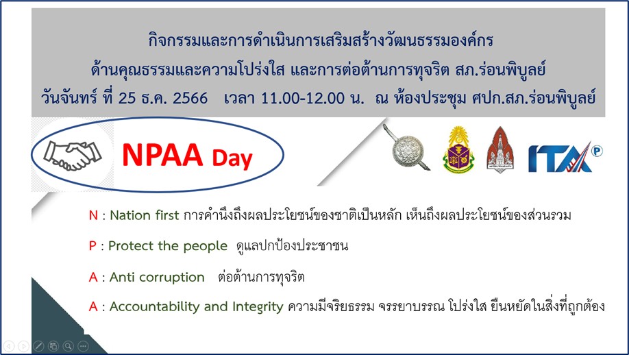 กิจกรรมวันส่งเสริมจริยธรรม จรรยาบรรณ ความโปร่งใส และต่อต้านการทุจริต /ต่อต้านการรับสินบน ในหน่วยงาน ไฟล์ Pdf และ word